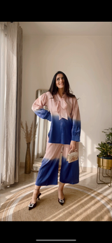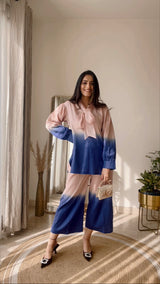 Dusk Co-ord Set designed in shades of nude pink and ink Blue coloured finest cotton and elegant Organza fabric, makes a statement for exquisiteness of the garment. A perfect style for a formal evening or a genteel afternoon.