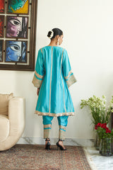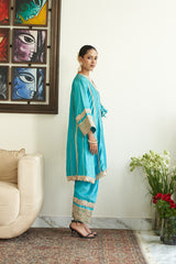 A striking turquoise blue Chanderi ensemble adorned with delicate embroidery and lace detailing on the kurta, paired with a Chanderi silk salwar enhanced with lace borders. The look is beautifully completed with a sage green silk dupatta finished with lace edging, exuding grace and sophistication. Perfect for festive gatherings and elegant soirées.
