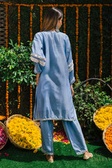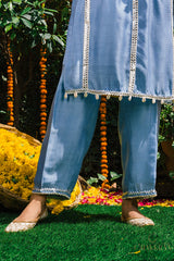 Lovely blue pure silk chanderi kurta set embellished with stunning laces & shell detailing. Chakkraa Aasman Kurta Set is best paired with Aasman Dupatta.