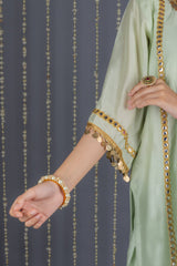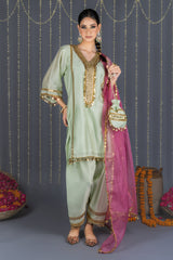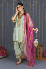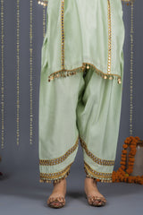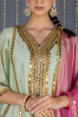 Chakkraa Adab kurta set - A Mint Green Pure Chanderi Silk shirt paired with a Kashmiri Salwar both adorned with mirror work and coin embellishments alongwith a deep Pink Organza Dupatta, creates a captivating and enchanting ethnic ensemble. The addition of mirror work and coin embellishments adds a touch of glamour and traditional charm, making the shirt truly eye-catching. The Pink Organza Dupatta complements the Mint Green shirt beautifully, creating a soft and feminine contrast. This combination of Mint Green and Pink, coupled with the mirror work and coin embellishments, creates a perfect balance between modernity and traditional craftsmanship.