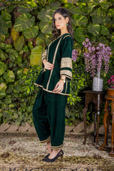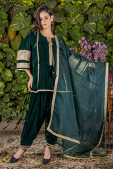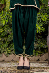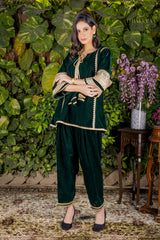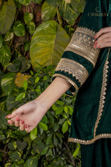 Beautiful green velvet short kurta set adorned with stunning gold laces and a smart salwar . Chakkraa Amaara Kurta Set is best paired with Amaara Dupatta.