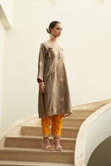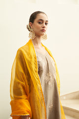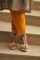 A sophisticated silk chanderi kurta with delicate floral embroidery, paired with bandhani pants highlighted with intricate detailing. The bright yellow organza dupatta adds a festive charm, making it perfect for both day and evening celebrations.