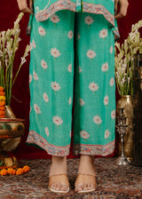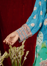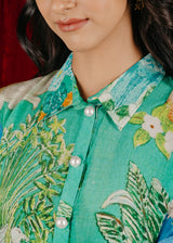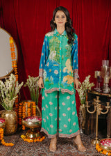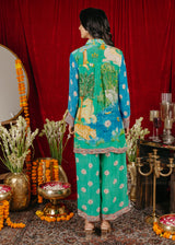 Chakkraa Bliss Co-ord Set is a captivating traditional ensemble made of natural crepe. The long shirt features an enchanting print depicting a serene nature scene with lush greenery and various animals including tigers and birds. The color palette includes vibrant shades of blue and green, accented with delicate floral patterns. The shirt is paired with matching green pants adorned with soft pink floral motifs and a decorative border at the hem enhance the overall elegance and charm of the attire.