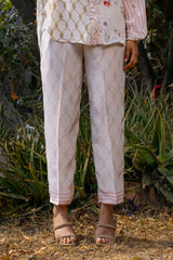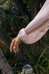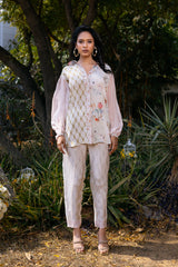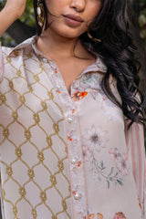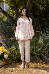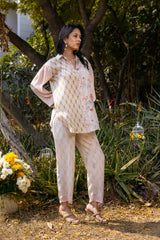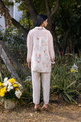 Introducing the "Blossom Blush Co-ord Set": This stunning ensemble features a charming blush pink and white floral print adorning the shirt. The shirt boasts elegant collar detailing and contrasting pink and white stripe sleeves, adding a touch of whimsy and sophistication. Crafted from natural crepe fabric, the straight pants ensure comfort and versatility. Perfect for any occasion, from brunch with friends to a garden party, this ensemble exudes grace and femininity with its timeless floral design and chic silhouette.