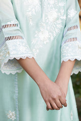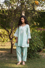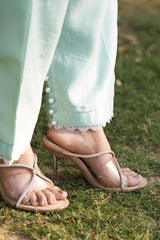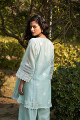 This elegant ensemble crafted from pure Chanderi silk features a pastel green kurta adorned with delicate floral embroidery. The kurta’s intricate detailing includes lace accents on the sleeves and scalloped edges for a graceful finish. Paired with stylish Kashmiri cut pants, the outfit showcases refined pearl botton detailing, including scalloped hems that beautifully complement the overall look. Perfect for festive gatherings and sophisticated summer wear.