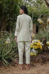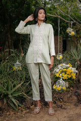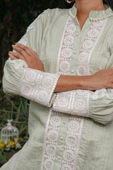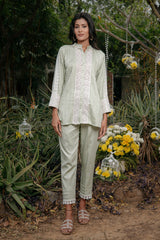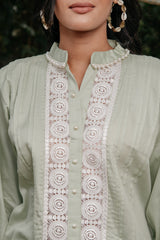 Pastel Green Co-ord Set crafted from premium pure cotton, exquisitely embellished with delicate lace and intricate pearl detailing. Elevate your wardrobe with this elegant ensemble, perfect for both casual outings and special occasions.