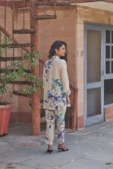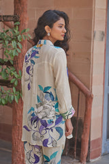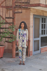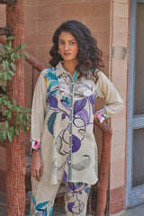 This elegant natural crepe outfit features a button-down shirt with a vibrant floral and abstract pattern in shades of blue, purple, and green. The coordinated straight-leg pants mirror the same artistic motifs, creating a chic and harmonious look.