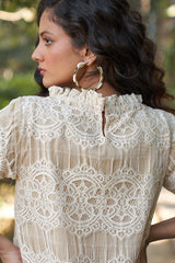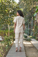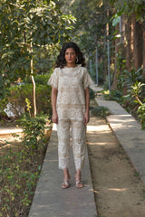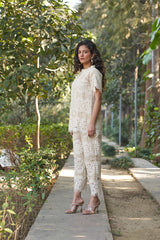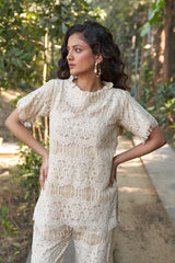 A timeless co-ord set crafted in soft cotton lace with pure cotton lining for all-day comfort. Featuring a delicate scalloped top with flutter sleeves and straight-fit pants, this ensemble is ideal for breezy brunches or intimate gatherings.