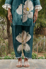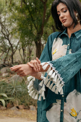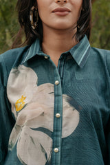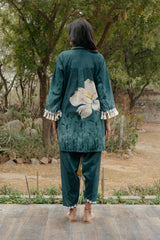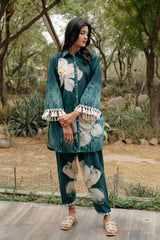 Introducing the "Forest Bloom Ensemble": This exquisite bottle green co-ord set features a long shirt adorned with bold white big flowers, evoking the beauty of a lush forest in bloom. The shirt is intricately adorned with lovely laces, delicate tassels, and elegant Pearl button detailing, adding a touch of sophistication and charm. Paired with Kashmiri cut pants, crafted for comfort and style, this ensemble offers a timeless and versatile look suitable for various occasions. Whether for a formal event or a casual outing, the Forest Bloom Ensemble exudes elegance and grace with its intricate detailing and chic silhouette.