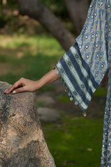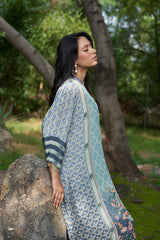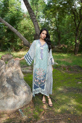 Immerse yourself in understated luxury with Firoza from our Nayaab collection. This breezy kaftan in natural crepe features an intricate floral trellis pattern in soft turquoise hues, framed by delicate prints and tassel details. Lined with a pure cotton slip for all-day comfort, Firoza is perfect for festive soirées or leisurely summer evenings.