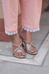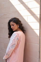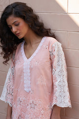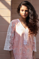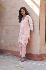 This beautiful outfit is crafted from soft cutwork cotton fabric in a delicate pastel pink hue. The kurta features intricate floral cutwork patterns along the hemline, neckline, and sleeves, adding a touch of elegance. The lace detailing on the sleeves enhances the feminine charm. Paired with kashmiri-cut pants adorned with subtle lace at the hem, this ensemble is perfect for a breezy, sophisticated summer look.