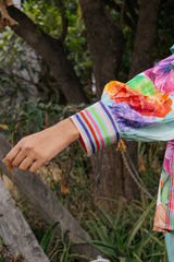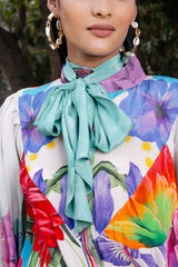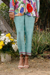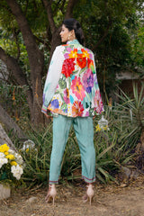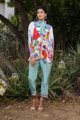 Introducing the "Frosty Florals Co-ord Set": This stunning ensemble showcases an ice blue color palette adorned with vibrant, printed big floral motifs, infusing it with a sense of freshness and vitality. The shirt features a charming bow around the neck and loose-falling sleeves with striped cuff detailing, adding a touch of sophistication and whimsy. Paired with self-print ice blue pants crafted from natural crepe fabric, this ensemble offers both comfort and style. Perfect for a daytime event or a casual outing, the Frosty Florals Co-ord Set exudes elegance and grace with its unique design and chic silhouette.