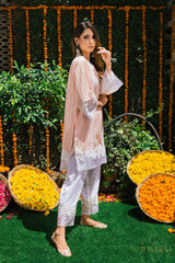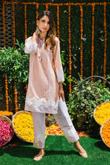 Pretty, peach kurta made from cutpressor fabric, lined with 100% cotton, embellished with pure cotton laces. The beautiful neckline is adorned with tassel dori paired with ankle-length , gulab pants.