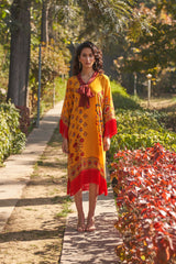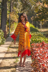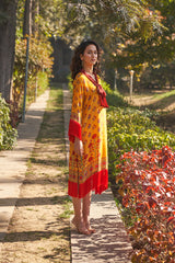 This vibrant yellow dress features cheerful red floral prints, radiating a lively summer vibe. The neckline is adorned with a playful bow, adding a charming touch. Red fringe lace embellishes the borders and sleeves, creating a beautiful contrast and enhancing the dress’s bohemian appeal. Perfect for casual outings and sunny day events.