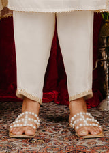 The Kashmiri salwar complements the kurta, matching its cream color and featuring detailing at the ankle.