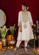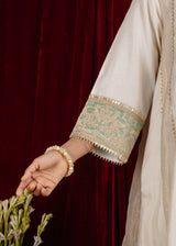 "Chakkraa Husna Kurta Set." is crafted from pure silk chanderi fabric, which is known for its exquisite texture and elegance. The ensemble features a combination of cream and sage green colors with intricate embroidery.