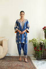Bold, graceful, and steeped in heritage, Kanakavya is a timeless kurta salwar set crafted in rich silk chanderi. The deep royal blue kurta is delicately embroidered with silver threadwork, radiating understated grandeur. Its paired Kashmiri salwar, with intricate detailing on the cuffs, brings cultural craftsmanship to the forefront.