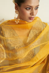 The look is elevated with a luminous organza dupatta in golden yellow, adding vibrance and festive brilliance to the ensemble. A perfect balance of regal hues and refined textures, this outfit is ideal for weddings, festive evenings, and cultural celebrations.