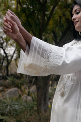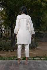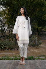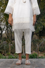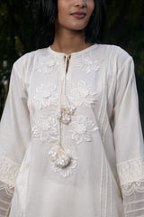 This white pure cotton kurta set exudes elegance with its intricate detailing. Adorned with the finest lace and delicate Pearl embellishments, the kurta is both stylish and refined. Perfect for a sophisticated and graceful look.