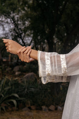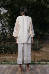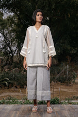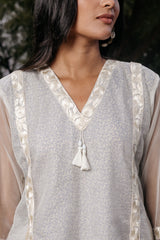 This organza fabric kurta set features a beautifully lined grey and white floral print kurta, accentuated with intricate laces and charming tassels. Paired with cotton pants, the ensemble combines the lightweight elegance of organza with the comfort of cotton, creating a stylish and versatile outfit for any occasion.