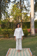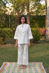 This elegant ivory co-ord set features a relaxed-fit top with a keyhole neckline and three-quarter sleeves, paired with straight-cut pants. Delicate embroidered patterns and lace detailing lend a refined, breezy charm, perfect for daytime outings or casual gatherings. Priced at ₹5,999/-, it offers a graceful blend of comfort and understated sophistication.