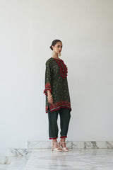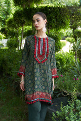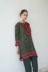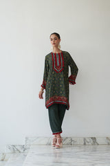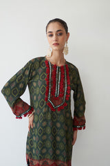 A graceful blend of heritage and ease, Meherbaan features a rich olive-green base with subtle ethnic motifs, contrast red accents, and delicate mirror work on natural crepe. From the Nayaab collection, this ensemble is a tribute to timeless charm and effortless elegance.