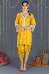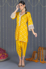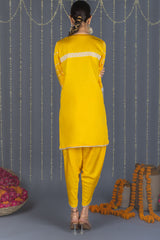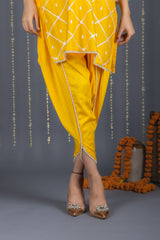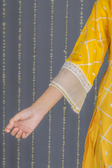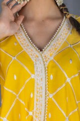 Chakkraa Mehr Embroidered Kurta Set- A Sunshine Yellow embroidered kurta set is a vibrant and elegant ensemble that radiates cheerful vibe. The set typically includes a fully embroidered kurta with organza finishing & lace embellishments paired along with very aesthetic tulip pants. The kurta is in a beautiful sunshine yellow color, exuding a bright and lively look. The highlight of this kurta set is the embroidery, which adds a touch of intricacy and charm to the outfit. This kurta set is perfect for celebratory occasions, festive events, or even semi-formal gatherings where you want to showcase a blend of sophistication .