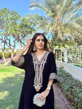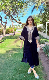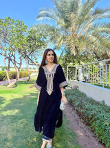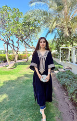 The outfit is an elegant, traditional ensemble in a rich navy blue velvet fabric. It features a loose, flowing kaftan with a deep V-shaped neckline adorned with intricate embroidery. The embroidery extends down the center and across the sleeves, creating a statement design that is both ornate and symmetrical.