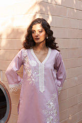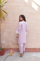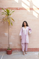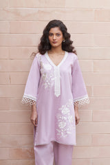 Elevate your everyday style with this soft mauve co-ord set crafted from pure cotton. Featuring delicate white floral embroidery and intricate lace detailing on the neckline, sleeves, and hem, this relaxed silhouette combines comfort with timeless elegance. Priced at ₹6,950/-, it’s a perfect blend of breathable luxury and refined craftsmanship.
