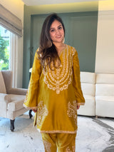 Bold, graceful, and steeped in heritage, Sitaara is a timeless kurta salwar set crafted in rich silk chanderi. The blueish grey kurta is delicately embroidered with whits and gold threadwork, radiating understated grandeur. Its paired Kashmiri salwar, with intricate detailing on the cuffs, brings cultural craftsmanship to the forefront.