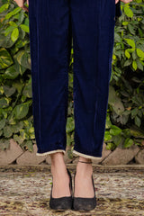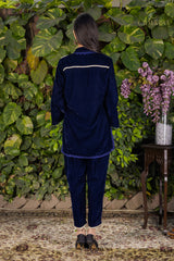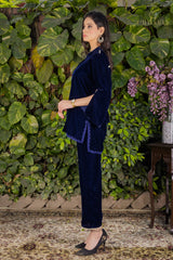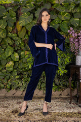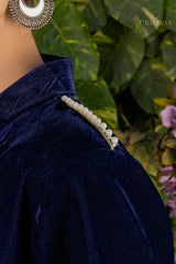 Chakkraa Nargis Co-ord Set is a stunning blue velvet coordinated set containing a gorgeous shirt with lace detailing & pearl detailing paired with straight pants with pearl lace detailing . Chakkraa Nargis Co-ord Set is comfortable yet stylish.