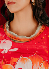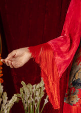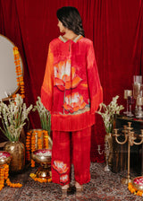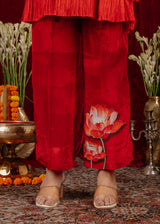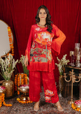 Chakkraa Passion Co-ord Set is a vibrant red co-ord set featuring bold lotus flower prints. The top has wide sleeves with fringe detailing along the hem and cuffs, adding texture and movement. The matching pants are adorned with complementary floral designs, creating a striking and cohesive look.