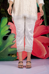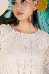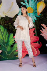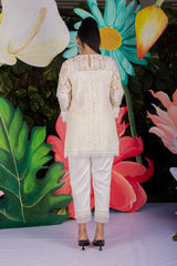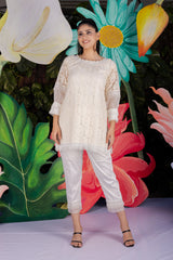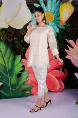 Pearl Co-ord Set designed in pure cotton net fabric,lined in cream colour, finished with soft pearls and trimmings is an epitome of grace and dignity