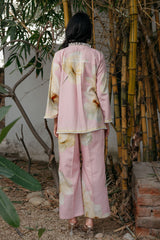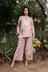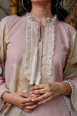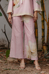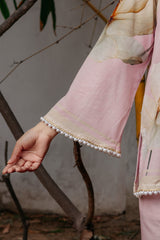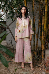 Introducing the "Joy Co-ord Set": This charming ensemble features a pretty pink base adorned with bold white big flowers, evoking a sense of floral elegance and romance. The shirt boasts delicate organza frill detailing on the neck, adding a touch of femininity and sophistication. Intricately adorned with lovely tassels and Pearl button detailing, the shirt exudes timeless charm and grace. Paired with loose pants for comfort and ease of movement, this set offers a perfect balance of style and comfort. Whether for a daytime event or a relaxed outing, the Joy Co-ord Set exudes effortless beauty and chic sophistication.