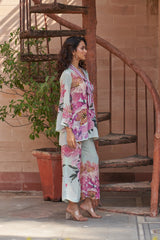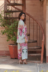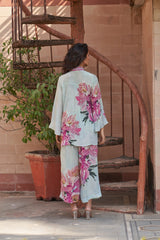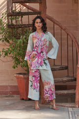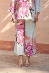 This natural crepe outfit features a soft pastel blue two-piece set adorned with bold pink floral prints. The tunic has a V-neckline with a striped bow tie detail and flared sleeves, adding a chic touch. The matching wide-leg pants carry the same floral motif, creating a vibrant yet elegant look.