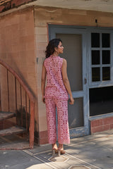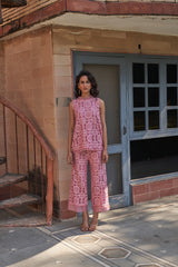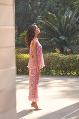 Crafted from delicate cotton lace with pure cotton lining, this elegant co-ord set blends comfort with sophistication. Featuring a sleeveless top and wide-leg pants, it’s perfect for both casual chic and formal occasions.