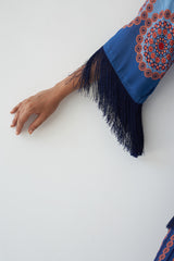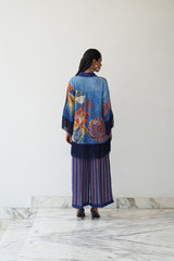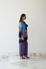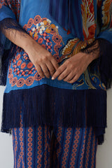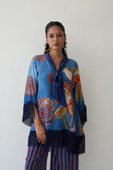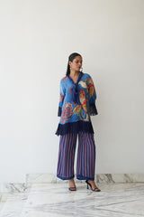 Rangrez bursts with artistic expression — a vibrant natural crepe ensemble featuring a painterly floral top with fringe detailing, paired with boldly printed wide-leg trousers. A playful yet poised piece from Nayaab, designed for those who wear color with confidence and grace.