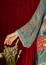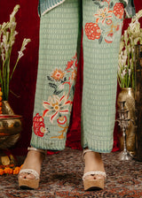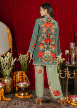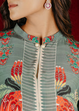 Chakkraa Rehmat Co-ord Set is a lovely green ensemble made of natural crepe fabric. It features an asymmetrical top with a front pattern of large floral prints in red, orange, and white. The sleeves and sides of the top also have intricate floral designs. The matching green pants have a subtle geometric pattern with similar floral print near the bottom.