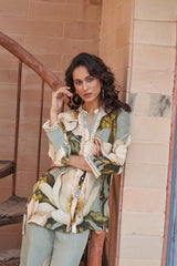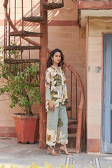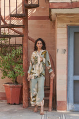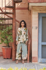 This natural crepe outfit features a soft sage green two-piece set with oversized white floral prints. The tunic has a delicate ruffled neckline with pearl button details and lace-trimmed sleeves, adding a feminine touch. The matching wide-legged pants carry the same floral motif, creating an effortlessly elegant and breezy look.