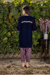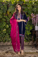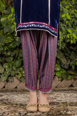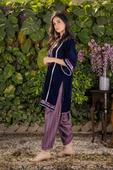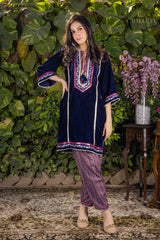 Laila Kurta set is a beautiful wine coloured velvet kurta set embellished with stunning gold shell laces and a lovely Kashmiri pleated Salwar in velvet comes along with . Chakkraa Laila Kurta Set is best paired with Laila Dupatta.