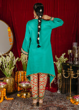 The kurta has an asymmetrical hemline, adding a modern twist to the traditional design. The emerald green color is vibrant and rich. It features intricate laces & coin tassels on the neckline and cuffs, along with the same tassels along the edges, adding a playful and elegant touch.
