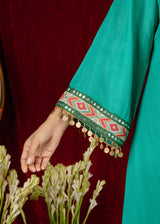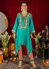 "Chakkraa Saarang Kurta Set." features an emerald green color and is crafted from pure cotton for the kurta and crepe for the pants.