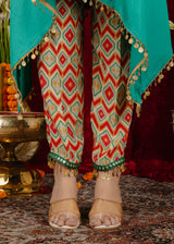 The printed crepe pants feature a colorful geometric pattern that complements the kurta’s embroidered lace. The combination of crepe fabric ensures a comfortable and stylish fit.