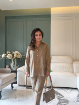 Elevate your everyday with this tailored beige-ish brown co-ord set, featuring a relaxed-fit button-down shirt and tapered pants. Crafted from 100% European organic linen, this set is breathable, sustainable, and effortlessly stylish. Perfect for travel, workwear, or minimalist luxury dressing.