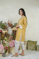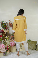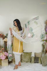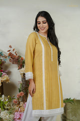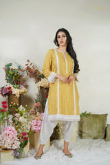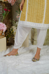 Cotton Kurta embellished with beautiful white laces ,pin tuck design & pearls finished with graceful organza fabric - Chakkraa Shyam Kurta Set will sort you out from day till night . Best paired with Chakkraa Applique pants and Chakkraa Kamal Dupatta.