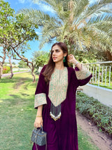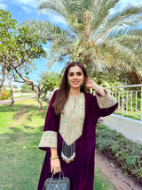 The outfit is an elegant, traditional ensemble in a rich maroon velvet fabric. It features a loose, flowing kaftan with green neckline adorned with intricate gold embroidery. The embroidery extends down the center and across the sleeves, creating a statement design that is both ornate and symmetrical.