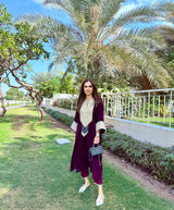 The sleeves are wide and feature detailed gold threadwork along the cuffs, adding a regal touch. The outfit is paired with matching salwat that has Lace trim at the ankles, complementing the overall design. This ensemble combines luxurious fabric with exquisite detailing, making it perfect for formal or festive occasions.
