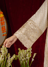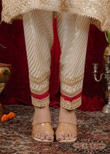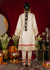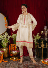 Chakkraa sohni kurta set is a traditional Indian ensemble made from pure silk chanderi fabric. The kurta is kalidar , cream-colored, featuring intricate gold embellishments with a touch of Rani pink that add a touch of elegance and sophistication. The kurta has a subtle pattern throughout and is paired with cream-colored pants that have a diagonal striped design, embellished with laces enhancing the overall look with a unique and stylish touch.