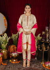 The dupatta draped over the shoulders is a striking hot pink colour, bordered with gold accents, which complement the cream and gold of the kurta and pants.