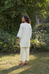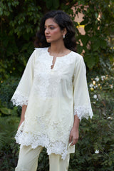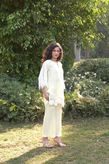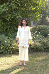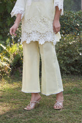 This elegant outfit features a light pastel lemon yellow cotton kurta with intricate white lace detailing along the hemline and sleeves, giving it a refined and airy look. The three-quarter sleeves add a modern touch, while the pants maintain a clean and minimal aesthetic along with beautiful cutwork. Perfect for a comfortable yet sophisticated summer wear option.